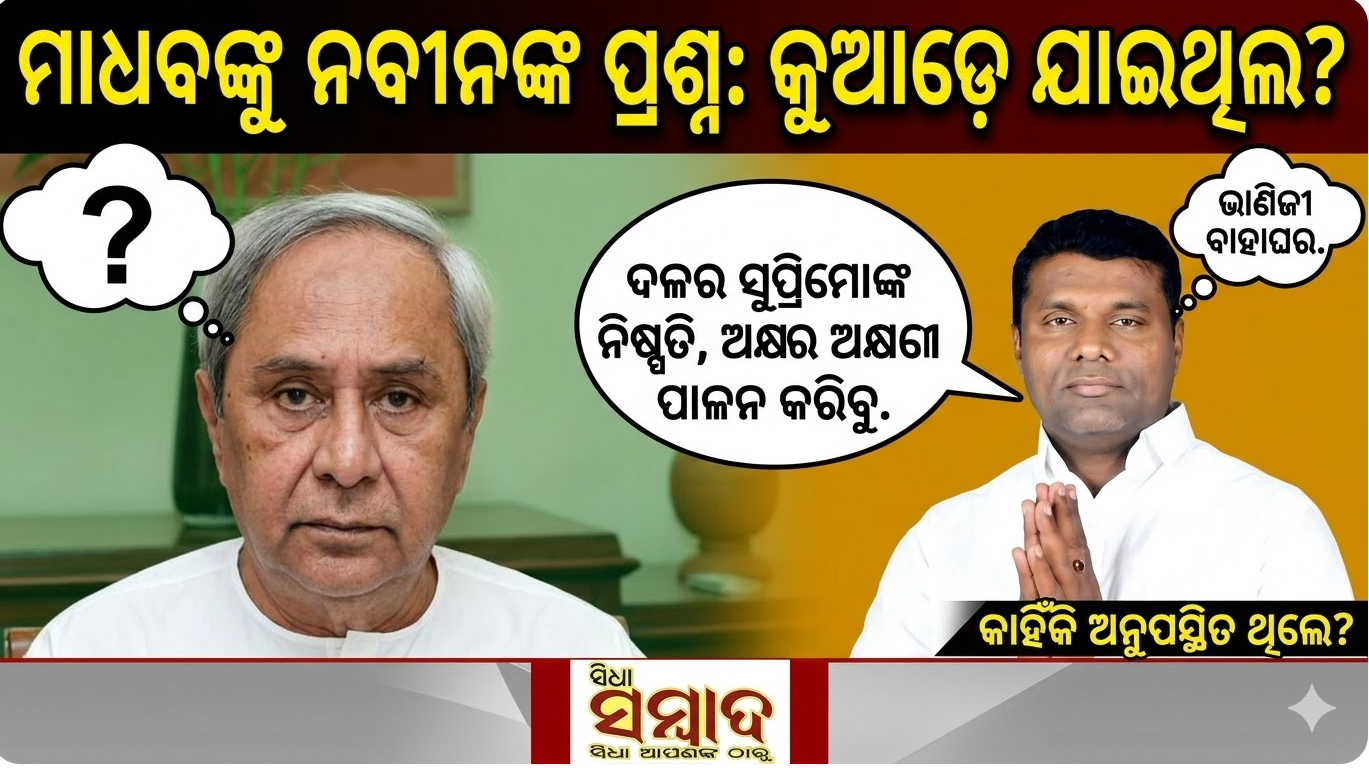 • ବିଧାନସଭାରେ ଅନୁପସ୍ଥିତ ରହିବା ନେଇ ନବୀନ ପଟ୍ଟନାୟକଙ୍କ ପ୍ରଶ୍ନର ଉତ୍ତରରେ ମାଧବ ଧଡ଼ା କହିଛନ୍ତି ଯେ, ଭାଣିଜୀ ବାହାଘର ଯୋଗୁଁ ସେ ଆସିପାରିନଥିଲେ।