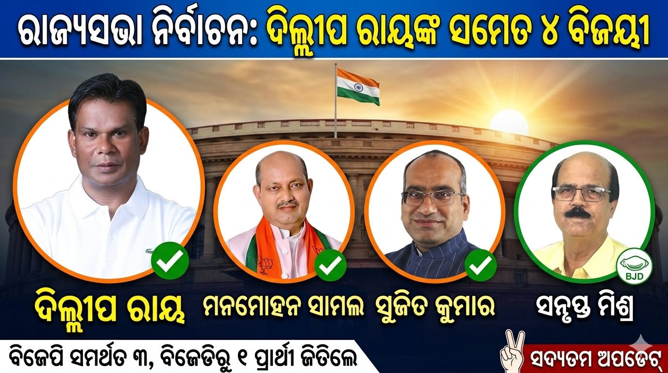 ଆଜି (୧୬ ମାର୍ଚ୍ଚ ୨୦୨୬) ଅନୁଷ୍ଠିତ ହୋଇଥିବା ରାଜ୍ୟସଭା ନିର୍ବାଚନରେ ଦିଲ୍ଲୀପ ରାୟଙ୍କ ସମେତ ମୋଟ ୪ ଜଣ ପ୍ରାର୍ଥୀ ବିଜୟୀ ହୋଇଛନ୍ତି।